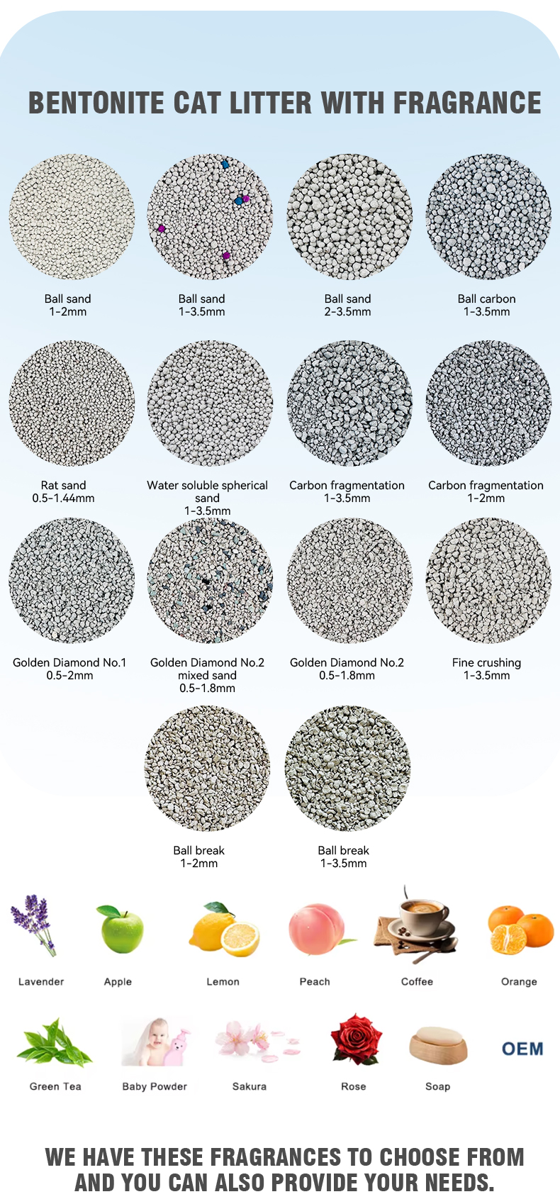 The company provides comprehensive customization services. You can customize the product's fragrance, color, packaging design, and brand logo. This is ideal for pet supply brands looking to create their own private-label cat litter product line.