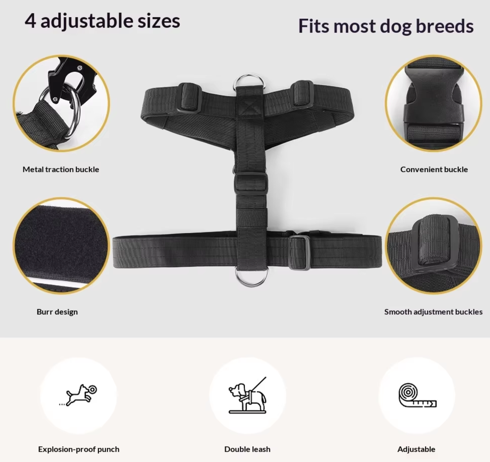 The Crownpet CP--PH0008 is a multifunctional tactical harness designed for professional training, outdoor adventures, and daily use with small, medium, and large breed dogs. Crafted from durable nylon, this vest-style harness features an adjustable no-pull design, heavy-duty buckles, and a MOLLE (Modular Lightweight Load-carrying Equipment) system for attaching additional gear. It is particularly suitable for working dogs, service animals, and pet owners seeking enhanced control and comfort during walks.