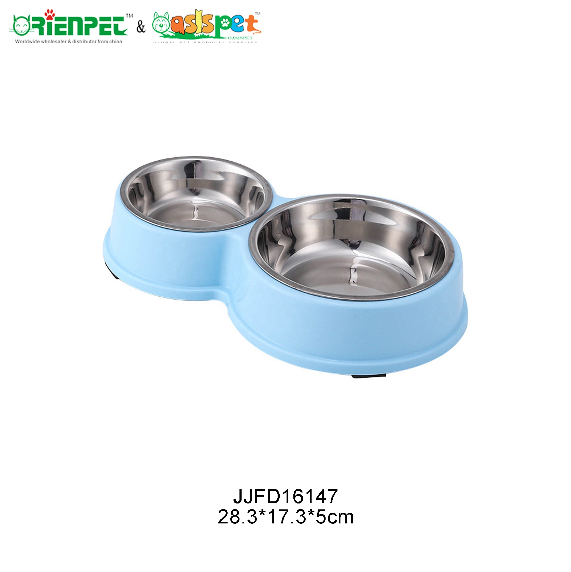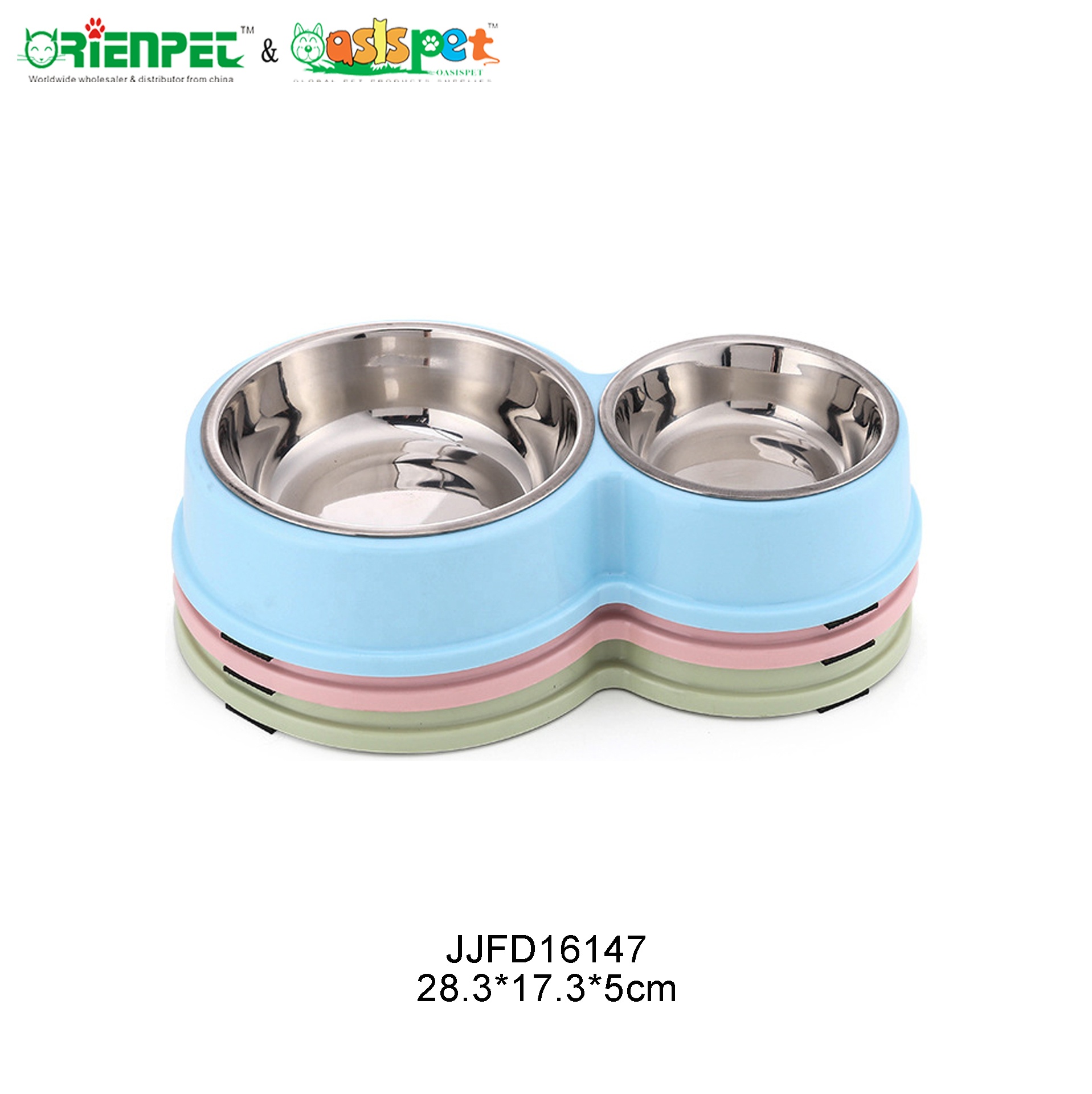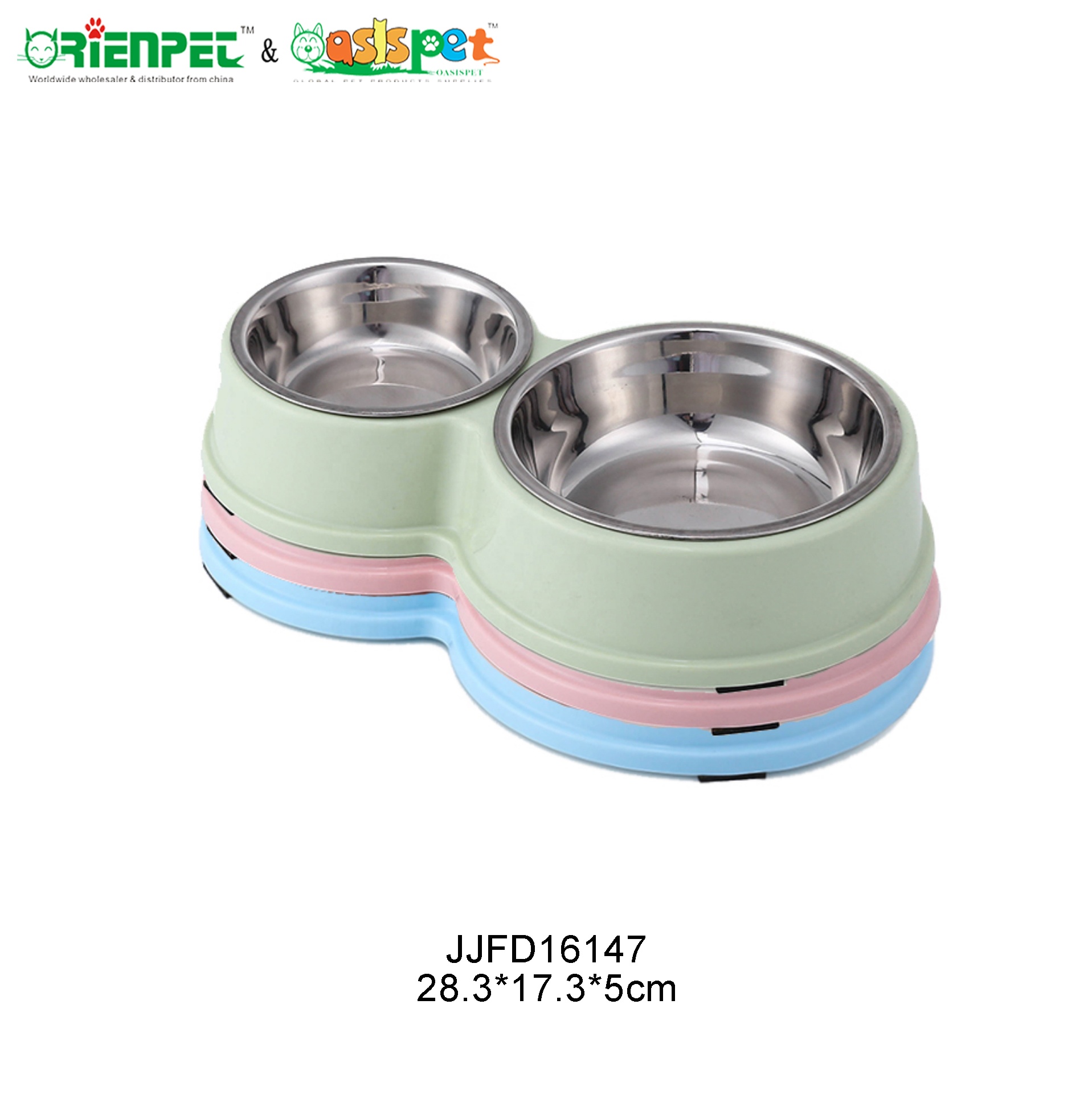 The ORIENPET & OASISPET JJFD16147 is a dual-branded pet feeder bowl designed for dogs, cats, and small animals. Manufactured by Nantong Orient Pet Co., Ltd., this product features a combination of plastic and stainless steel materials, offering waterproof functionality suitable for indoor, outdoor, and travel scenarios.