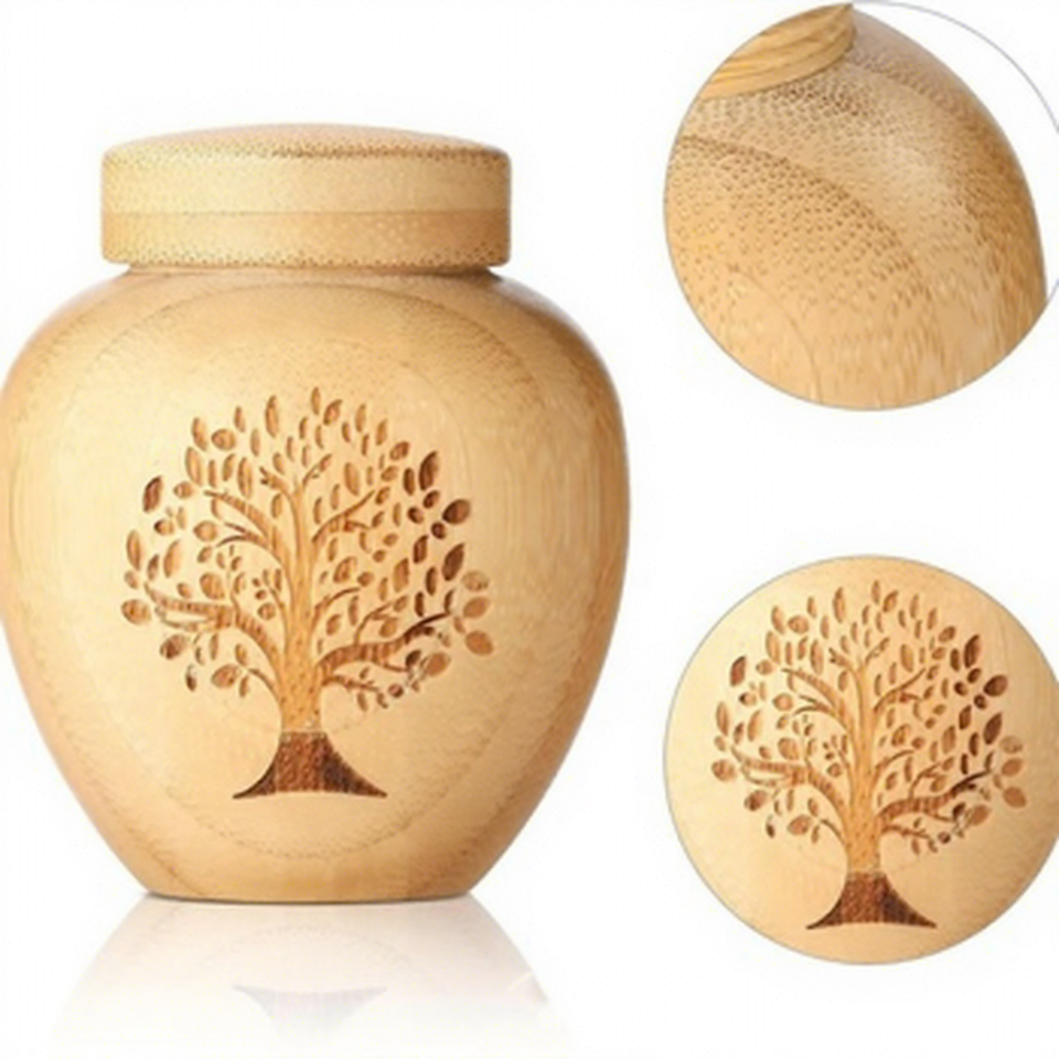 This is a modern, eco-friendly wooden urn designed for pets, featuring a "Tree of Life" design. It serves as a cremation casket box for dogs, cats, and other small animals, providing a dignified memorial option.