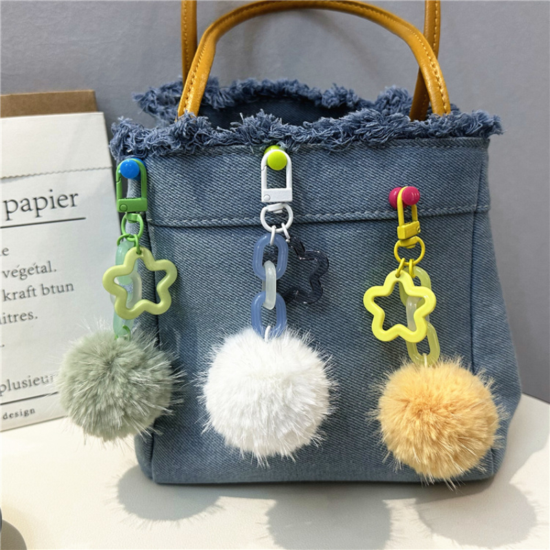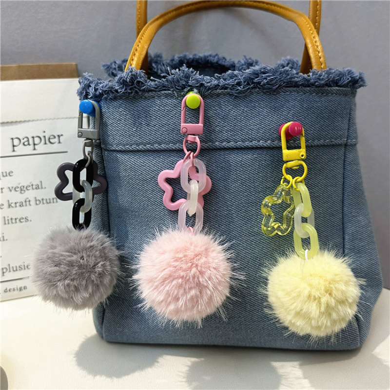 This creative cute fur ball flower keychain is a small, fresh, and colorful accessory that combines the softness of plush with a delightful candy-like aesthetic. Designed as a bag pendant, earphone cover, or general accessory, it appeals to a wide audience seeking kawaii and whimsical items. The product is available in various colors such as pink, green, and purple, and is sold wholesale, making it ideal for promotional gifts or retail.