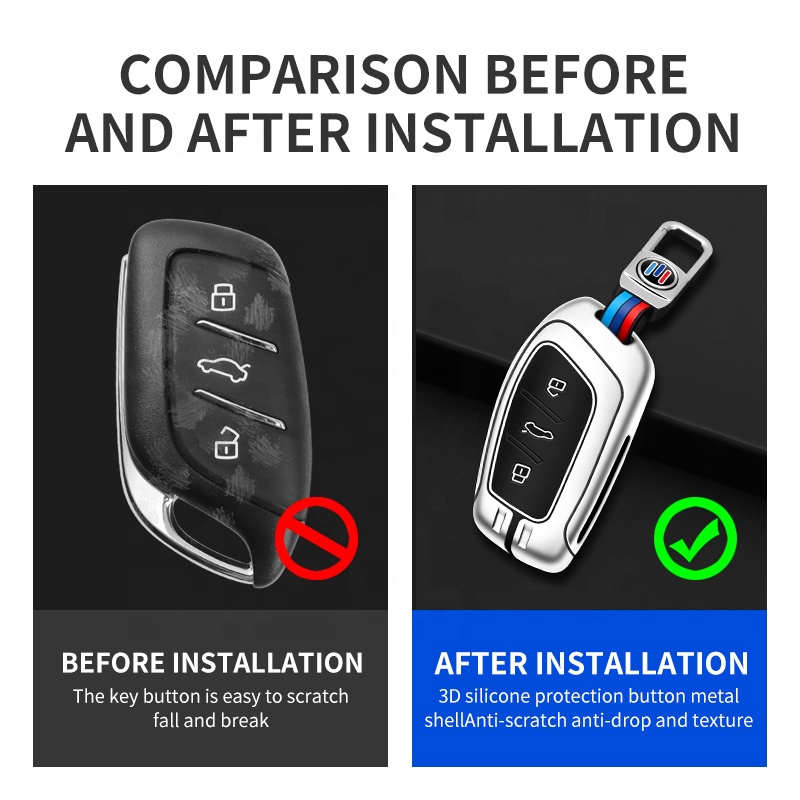 This key cover is designed for a precise fit. It typically consists of two alloy or leather halves that snap together around your original key fob. To install: